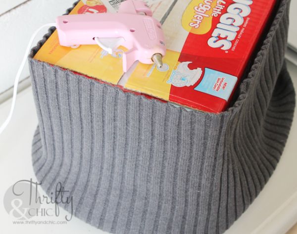 Agora, com o auxílio da pistola de cola quente, cole a borda da blusa na base do fundo da caixa de papelão.