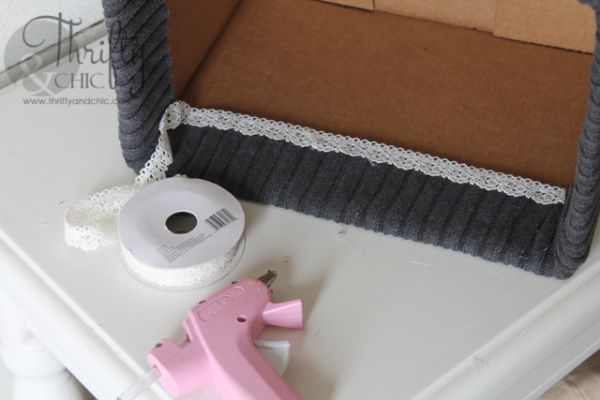 Logo após, cole o bico ou entremeio de renda na emenda entre a blusa e caixa de papelão, com o auxílio da pistola de cola quente.