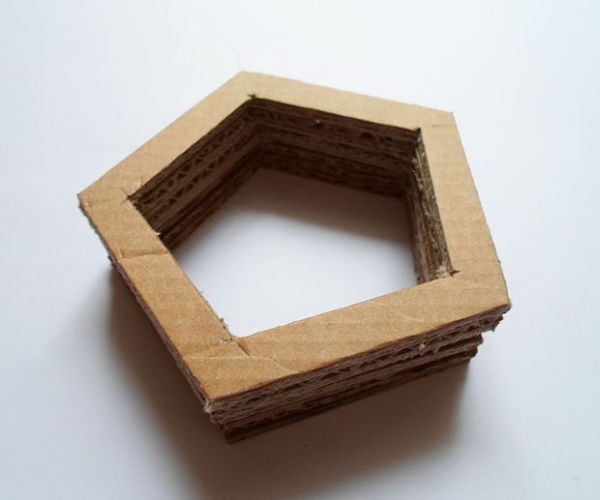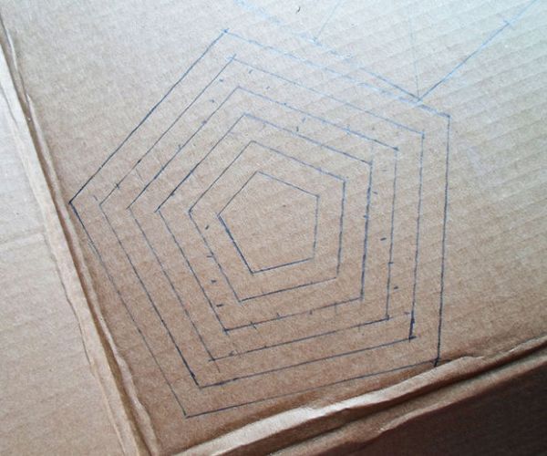 Comece transferindo as partes do molde para a caixa de papelão, desenhando e depois cortando pentágonos de diversos tamanhos.
