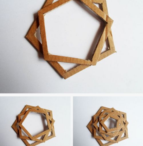 Em seguida, com o auxílio da pistola de cola quente, cole os pentágonos um sobre o outro e começando pelo maior, porém posicionando os pentágonos de forma que não fiquem alinhados.