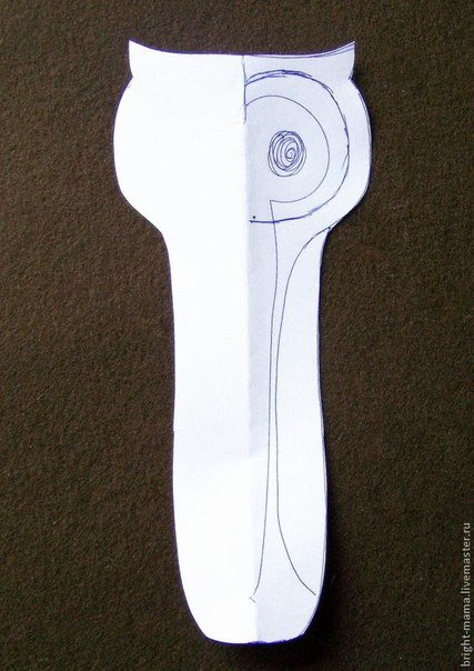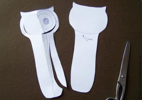 Em seguida, termine de fazer um contorno de coruja, com orelhas pontudas e detalhes na parte dos olhos. E também deixando mais larga a parte do corte da tesoura.
