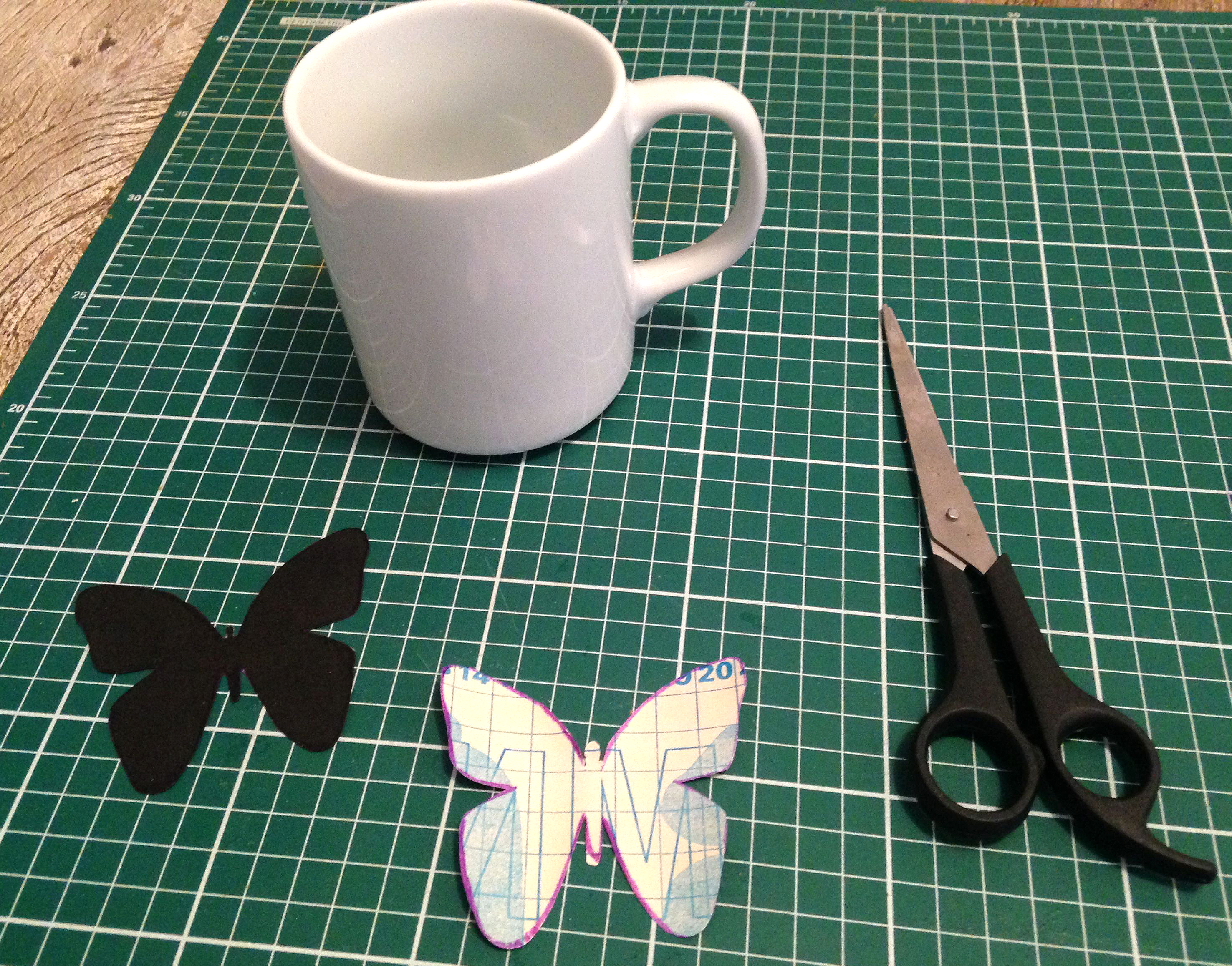 Para facilitar a sua vida, contorne a forma sobre um pedaço de vinil adesivo usando a canetinha. Recorte-a e cole-a sobre a caneca, de forma bem centralizada. Ao usar o vinil adesivo colado, garantimos que a forma fique no lugar durante todo o processo de pintura, deixando o acabamento bem mais bonito e seu desenho mais definido.