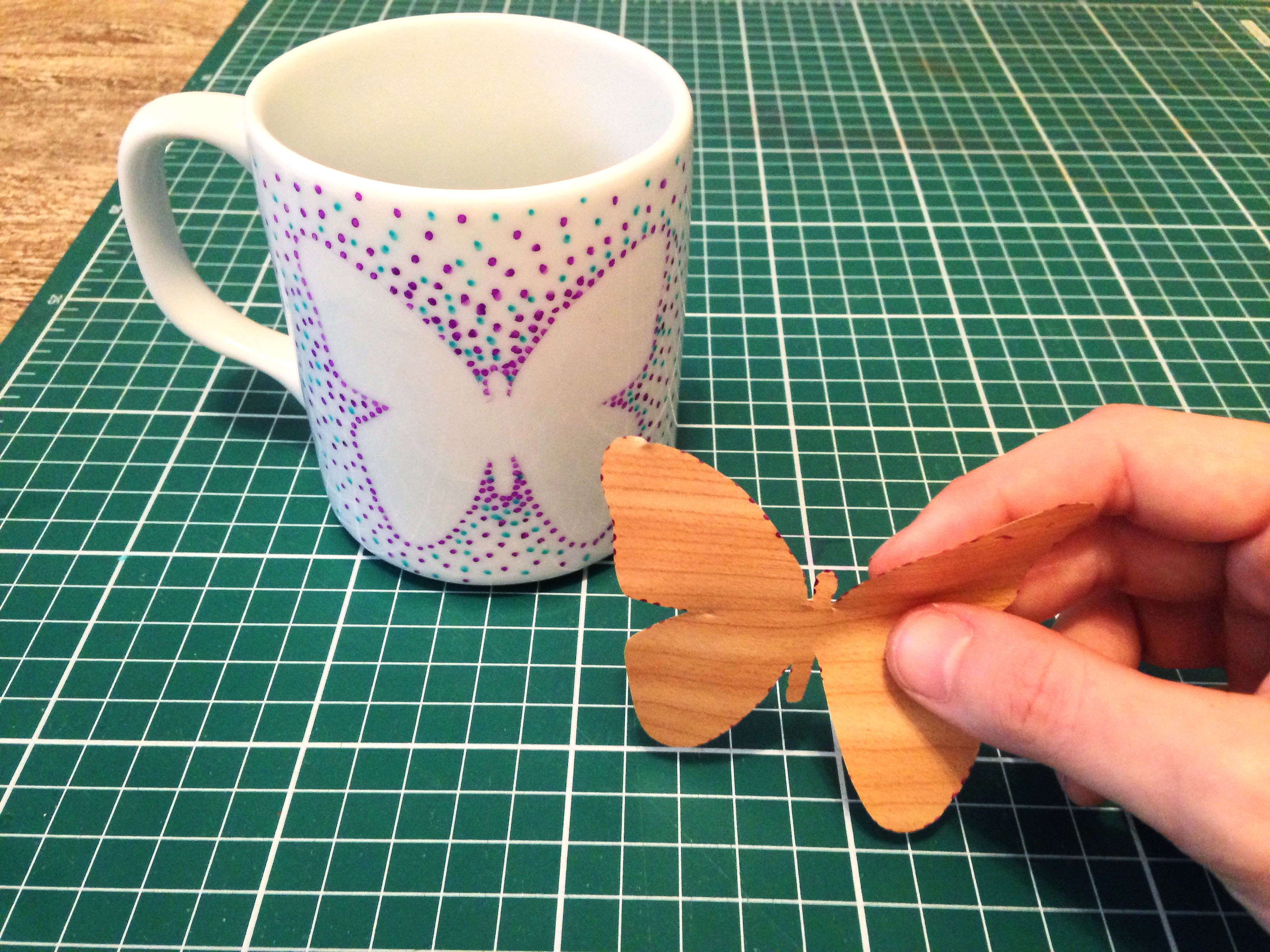 Pronto, agora vem a parte divertida: escolha duas ou mais cores de caneta permanente e faça pequenos pontinhos ao redor da sua forma. Os pontinhos devem ficar bem concentrados perto da forma e ir se dissipando conforme se afastam dela. Cuidado para não borrar a tinta da canetinha enquanto pinta, ok? Lembre-se de que estamos trabalhando com uma do tipo permanente. Depois de muitos, muitos pontinhos, sua caneca estará quase pronta!