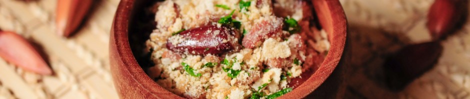Com o pinhão cozido e limpo, triture rapidamente no processador. Leve ao fogo médio com 1 colher de manteiga de garrafa, deixe o pinhão fritar ligeiramente e separe. Coloque a carne seca ao fogo médio com 1 colher de manteiga de garrafa, o alho e o leite de coco, também deixar fritar pouco.