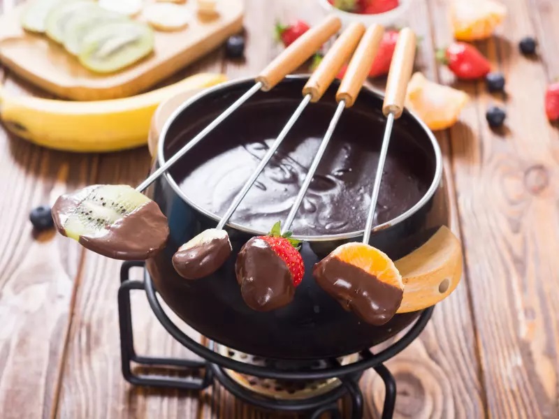Dê preferência ao chocolate amargo para que a refeição fique menos enjoativa. Nos acompanhamentos, acrescente bombons, marshmallow, waffers e frutas, sem esquecer que elas devem ser bem higienizadas e secas, para que não soltem água no chocolate.
