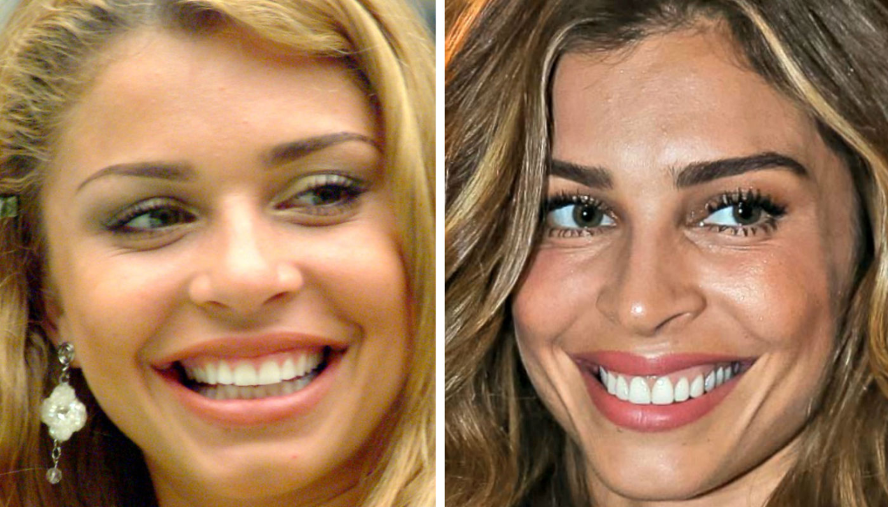 Outra atriz que transformou o visual com a aplicação das lentes de contato dentais foi Flávia Alessandra. Confira o antes e depois:
