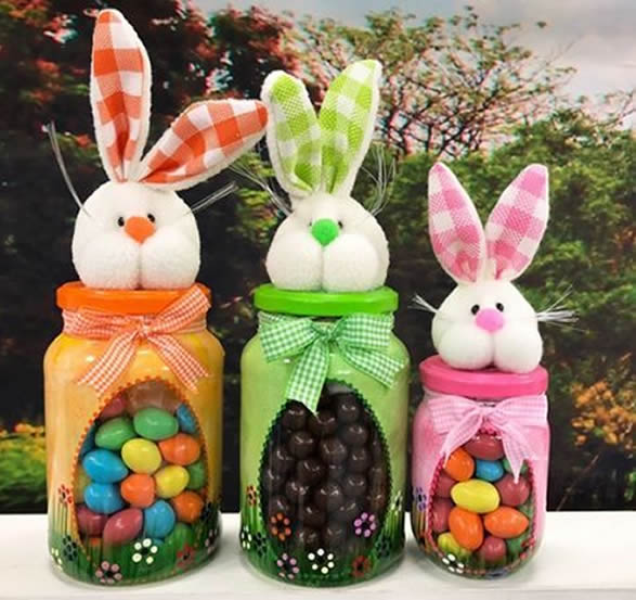 Você pode separar alguns potinhos que use em casa geralmente, ou comprar em casas especializadas. Depois, em casas de festa, compre jujubas para colocar dentro. Na tampa, um pompom de lã com orelhinhas de coelho, fecha o presente especial.