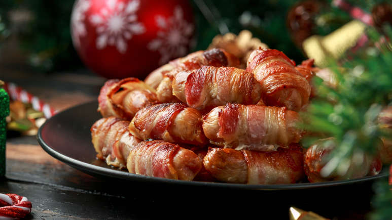 Enrole salsichas em bacon defumado para criar este clássico aperitivo britânico. Asse por 15-20 minutos e sirva com cobertura de mel, mostarda e alecrim.