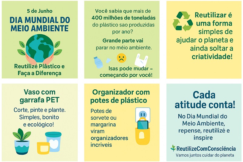 Pitaco: Neste Dia Mundial do Meio Ambiente, proponha um desafio a si mesmo: quantos objetos plásticos você consegue reaproveitar em casa nesta semana? Compartilhe suas ideias nas redes sociais e incentive seus amigos a participarem também!